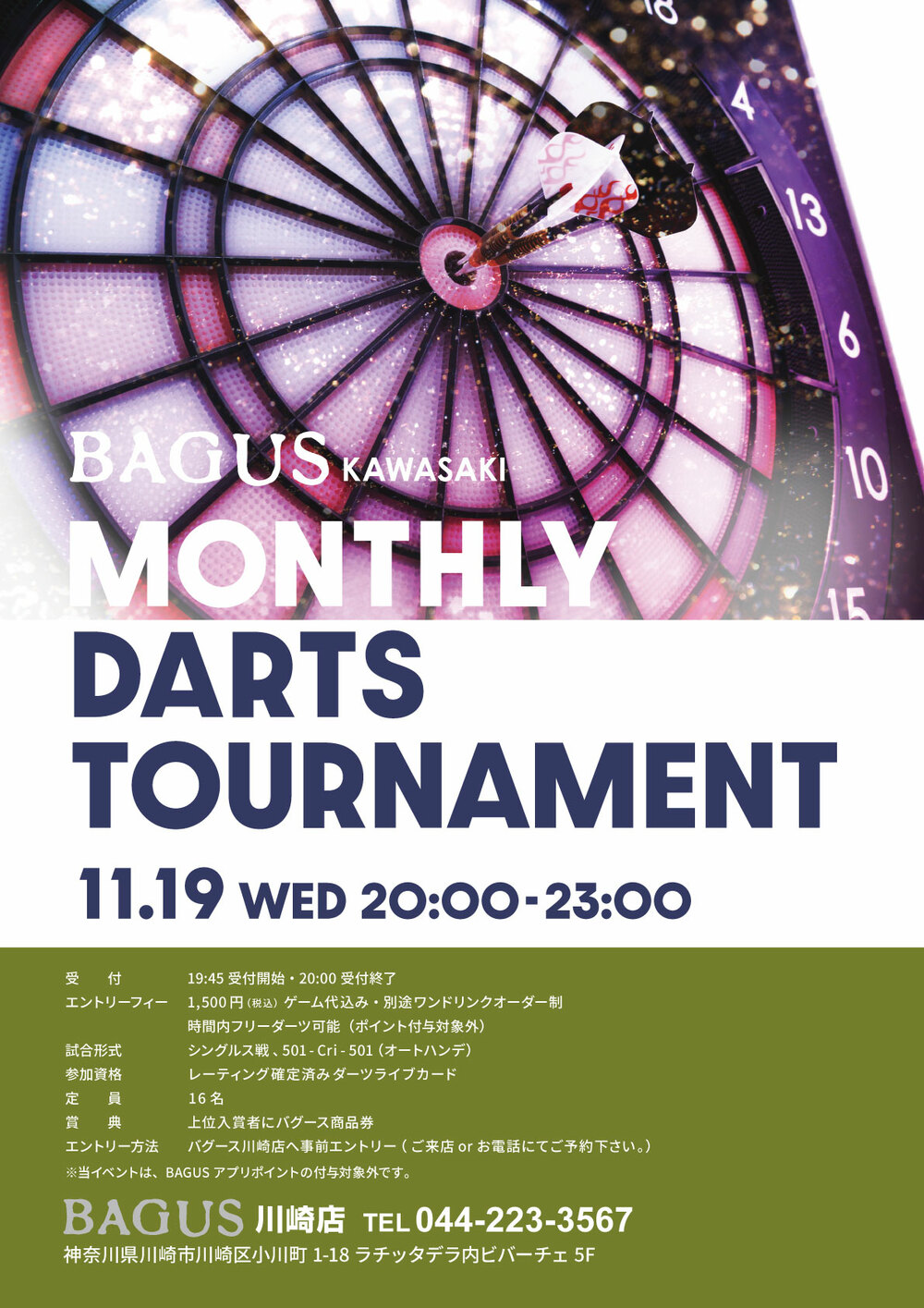 11月19日(水)バグース川崎店にて「MONTHLY DARTS TOURNAMENT」開催!