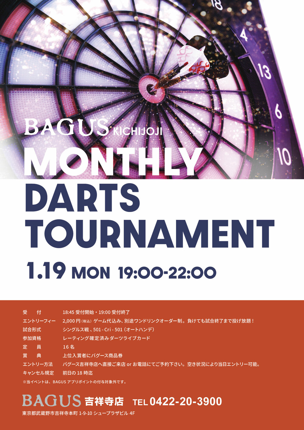 1月19日(月)バグース吉祥寺店にて「MONTHLY DARTS TOURNAMENT」開催!