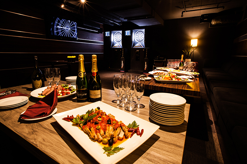 乾杯時には煌めくスパークリングワインをサービス。 ボリューム満点のビュッフェ料理とダーツや多彩なアミューズメントオプションでパーティーを華やかに盛り上げます。 ※飲み放題アップグレード+500円