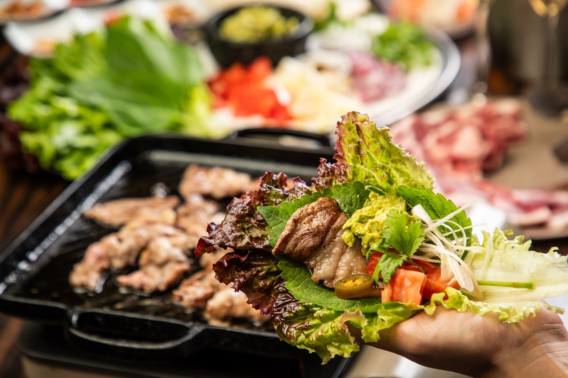 ラム肉をトマトやアボガド、ハラペーニョ、パクチーなどを包んで味わう新感覚サムギョプサル