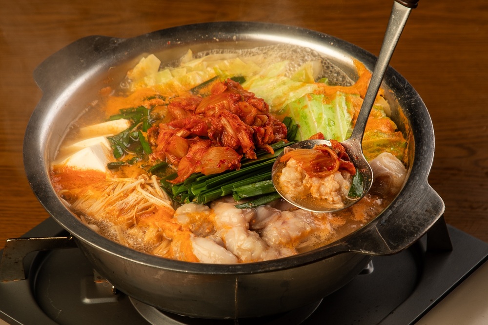 ぷりっとした国産牛モツの旨みが溶け込む、コク深い特製コチュジャンスープが自慢のもつ鍋。