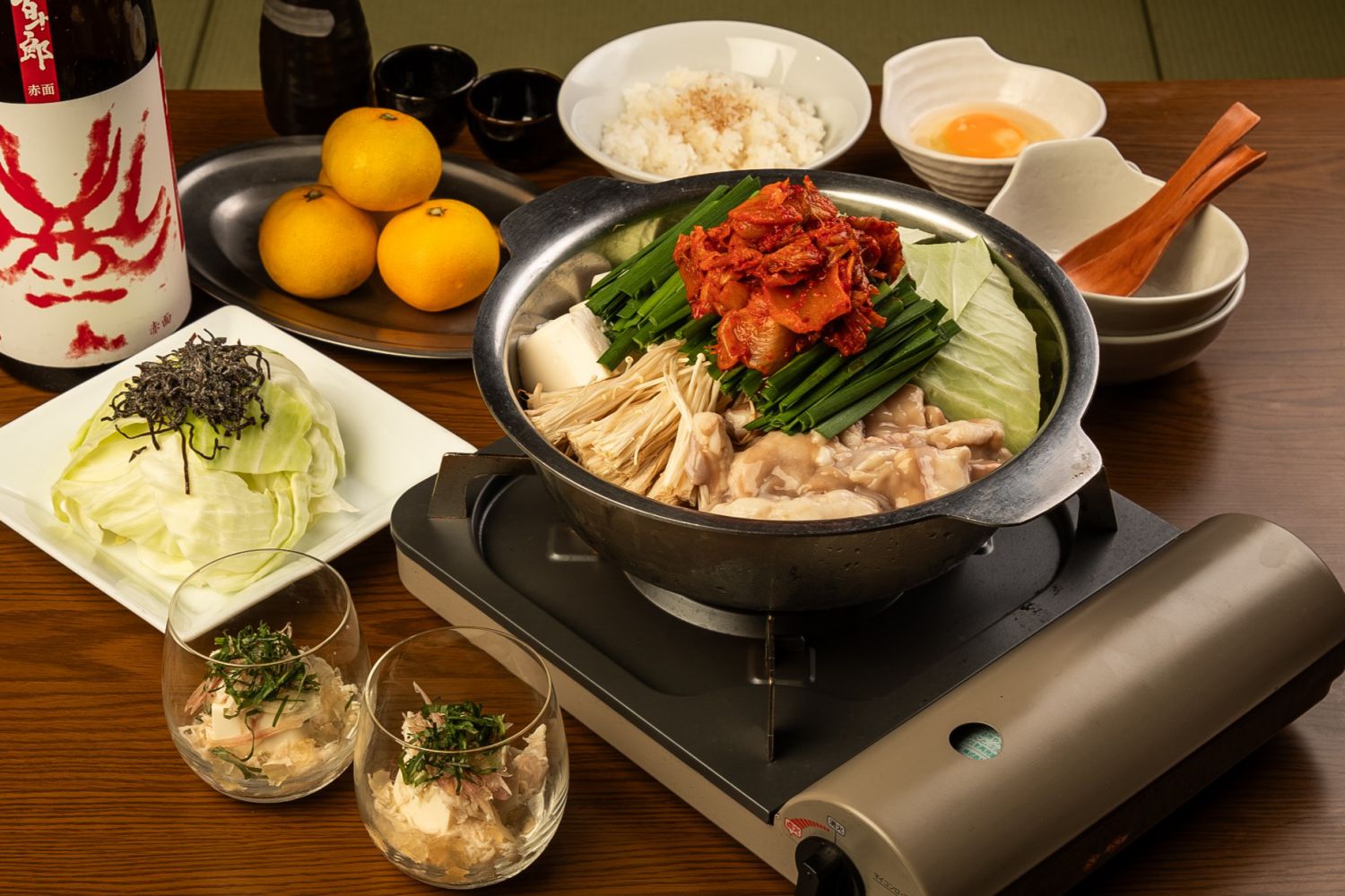 ぷりっとした国産牛モツの旨みが溶け込む、コク深い特製コチュジャンスープが自慢のチゲ鍋。 キャベツ、もやし、ニラ、えのき、豆腐、キムチなどの具材をたっぷりと加え、野菜の甘みと辛味が絶妙に調和します。 体の芯から温まる、ボリューム満点の一品です。