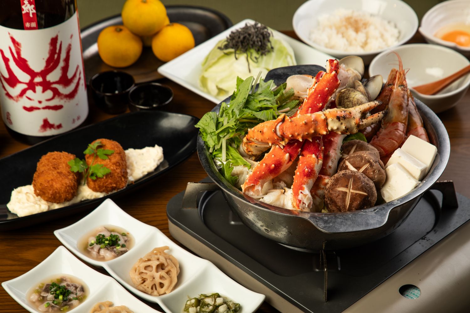 贅沢な特大サイズのタラバガニをメインに、海の幸をふんだんに使用した豪華鍋。 赤海老、大粒ホタテ、はまぐりの旨みが溶け出し、白菜、長ネギ、しいたけ、水菜とともに極上のハーモニーを楽しめます。 濃厚な海鮮出汁とタラバの甘みが口いっぱいに広がる、冬のごちそうです。
