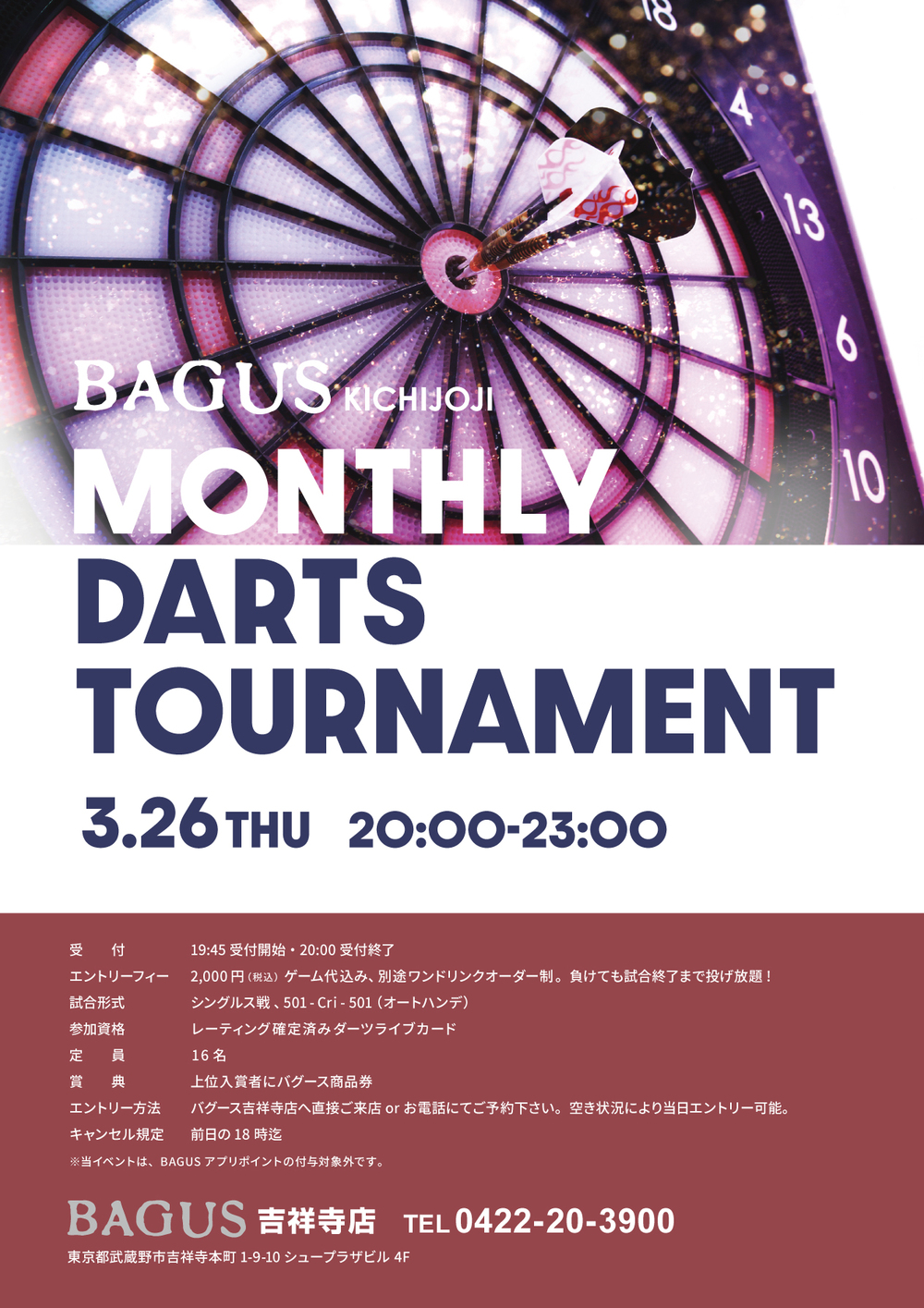 3月26日(木)バグース吉祥寺店にて「MONTHLY DARTS TOURNAMENT」開催!