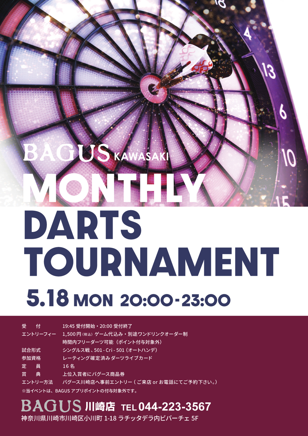 5月18日(月)バグース川崎店にて「MONTHLY DARTS TOURNAMENT」開催!