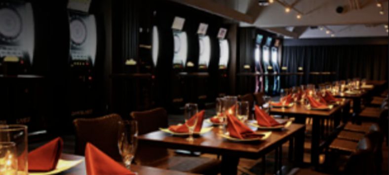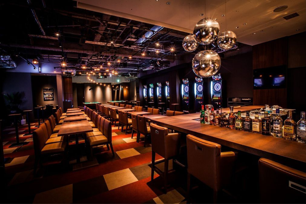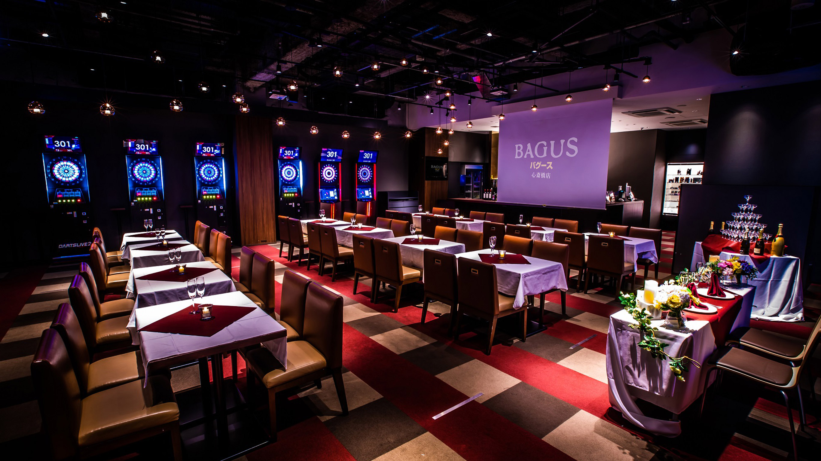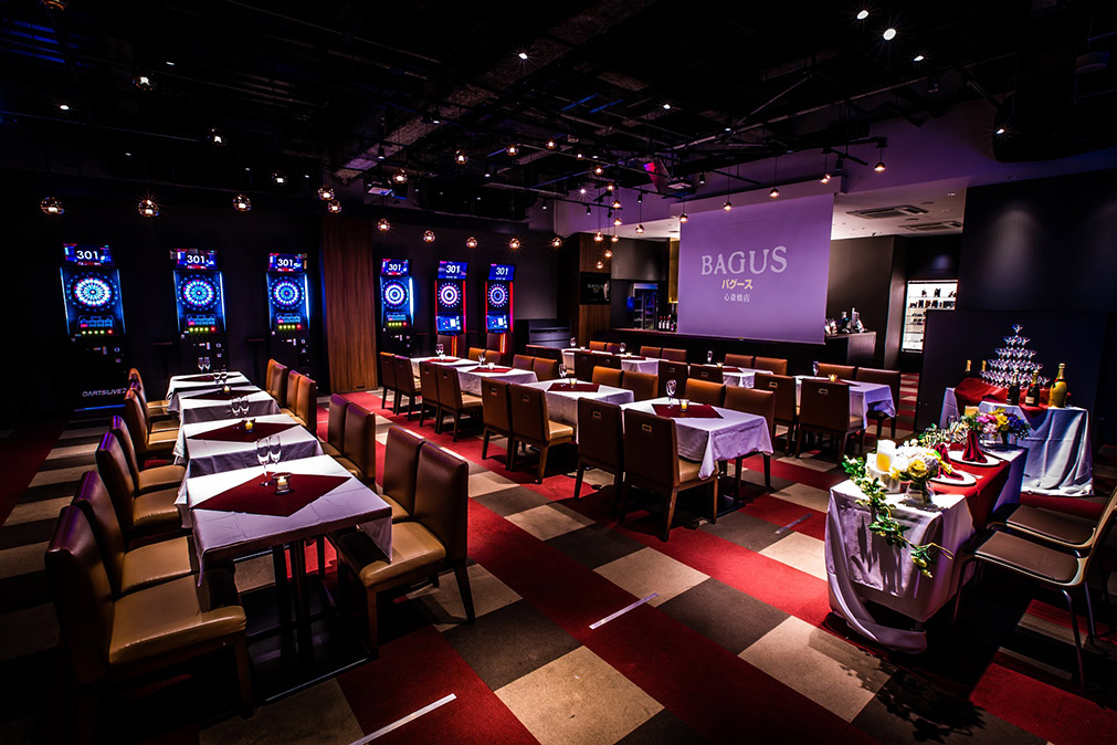 バグース心斎橋店は、アースカラーを基調としたスタイリッシュな店内で、結婚式二次会や忘新年会、歓送迎会、懇親会、パブリックビューイング等様々なパーティー・イベントをご利用いただけます。