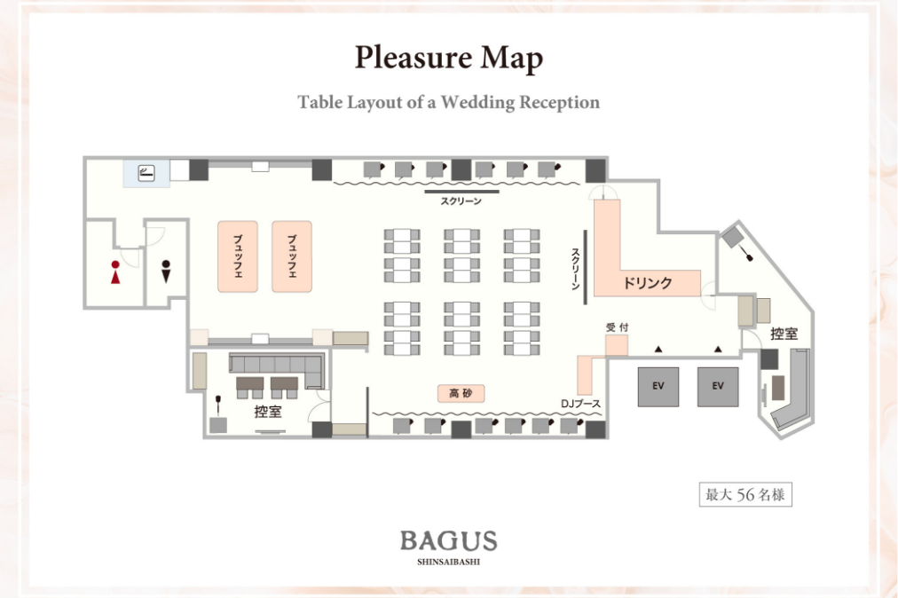 大型スクリーンを正面にゲストの方々がスクリーンと高砂席をご覧になりやすいレイアウトです。控室も2部屋ご用意が可能ですので、幹事様と新郎新婦の控室をそれぞれ別にご用意いたします。また、お客様の希望に沿ったレイアウト提案も行っておりますのでお気軽にお問合せください。