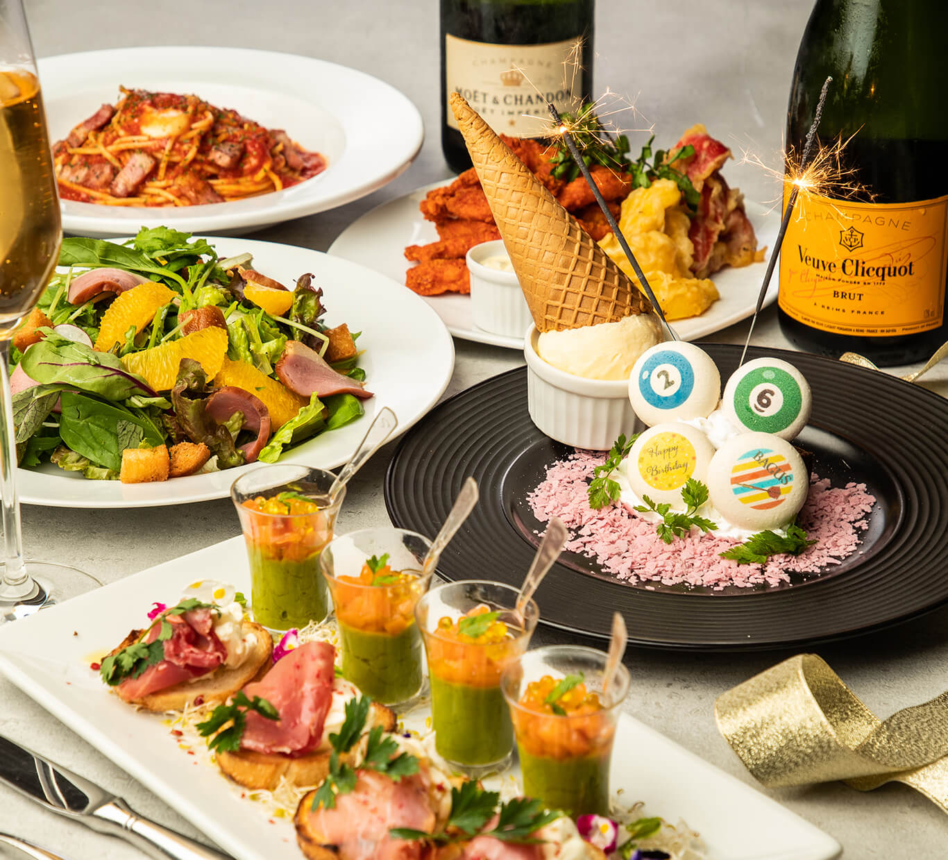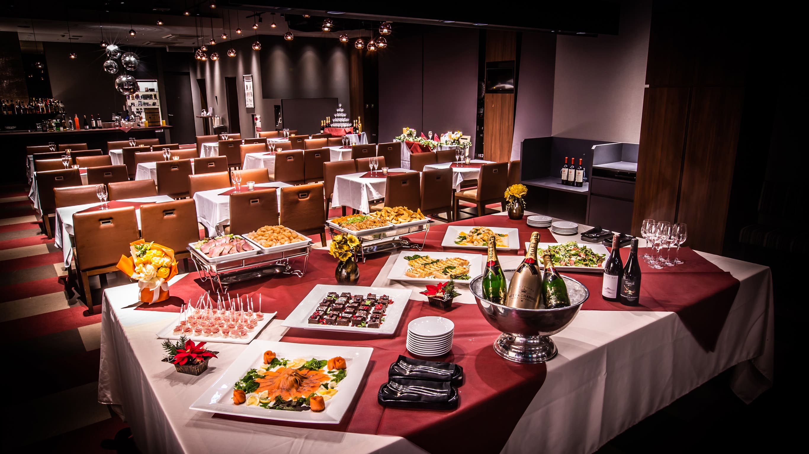 料理はご人数やご要望によって着席ビュッフェまたは、立食スタイルでご提供。華やかなビュッフェスタイルの料理を囲んで、ダーツやビリヤードのアミューズメントもお楽しみいただける、バグースならではのスタイリッシュな貸切パーティースタイルも人気です。