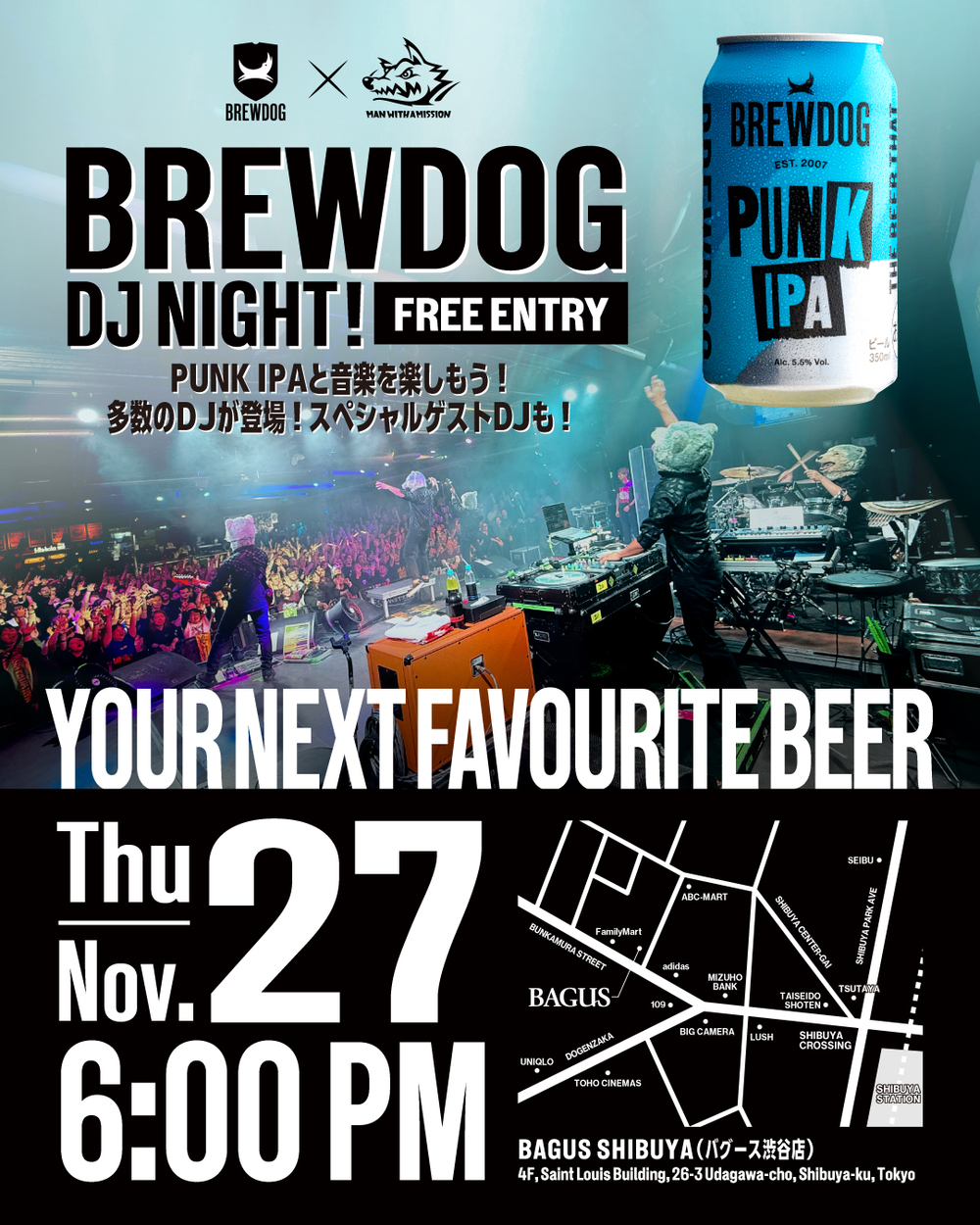 来たる11/27(木)、バグース渋谷店にて『BREWDOG×MAN WITH A MISSION DJ NIGHT』を開催!