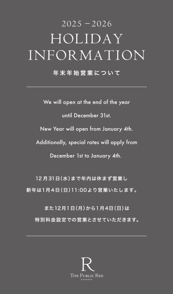 年末年始におきましては上記の通り、営業時間の変更や特別料金での営業を行います。