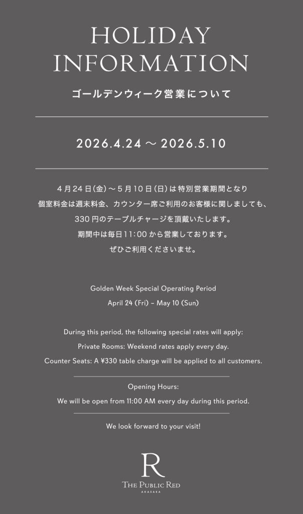 ゴールデンウィーク中におきましては上記の通り、営業時間の変更や特別料金での営業を行います。