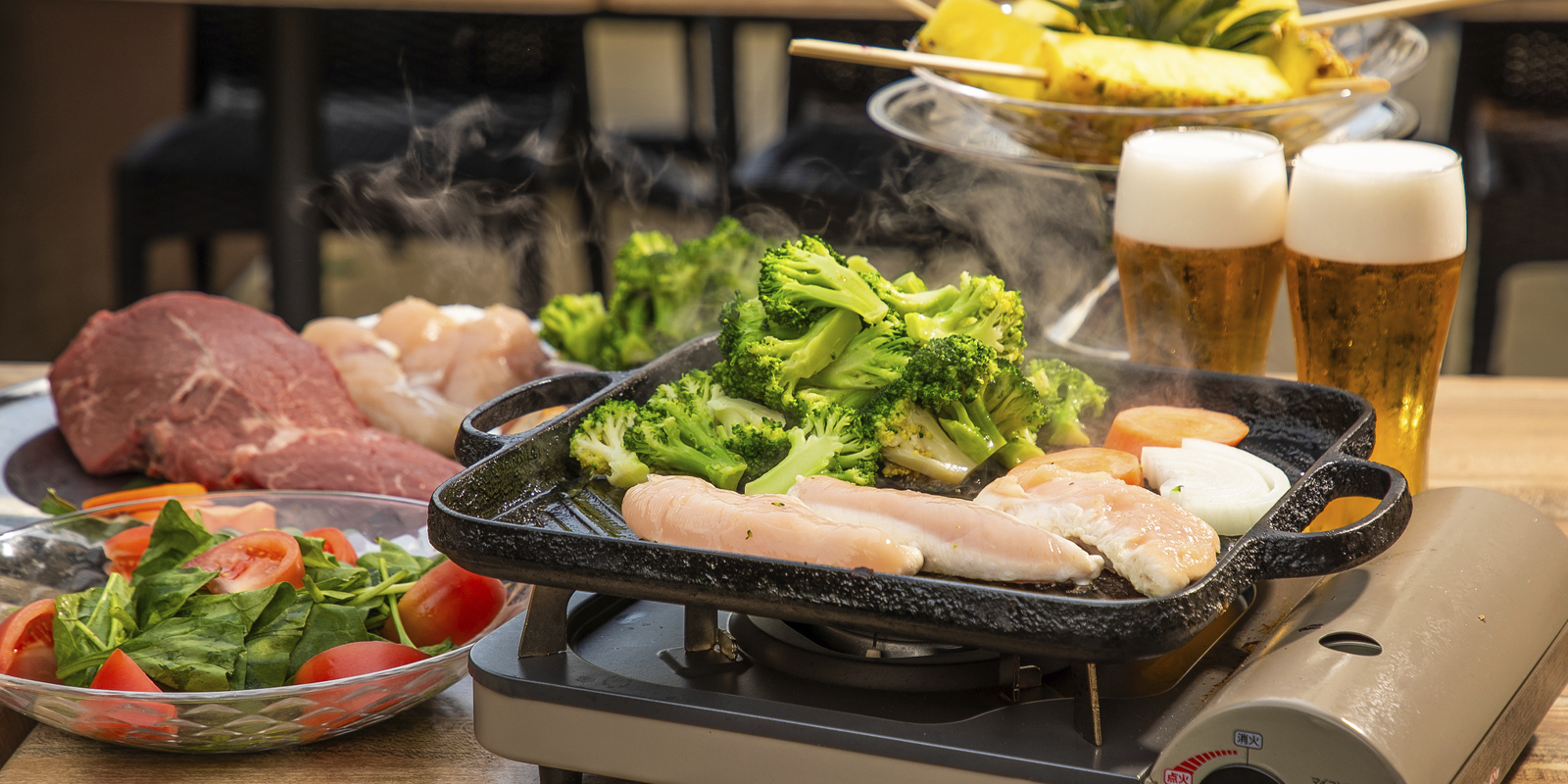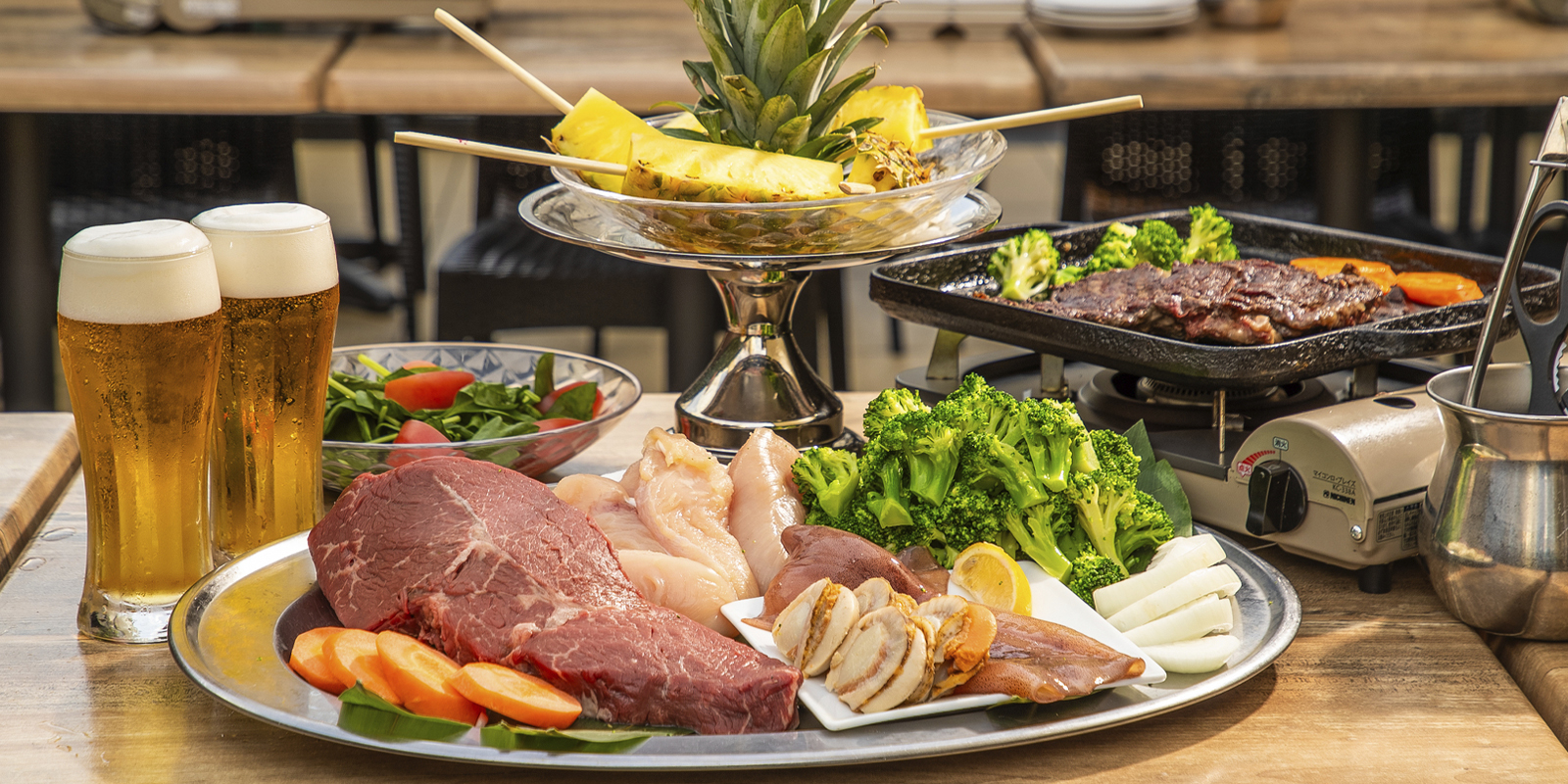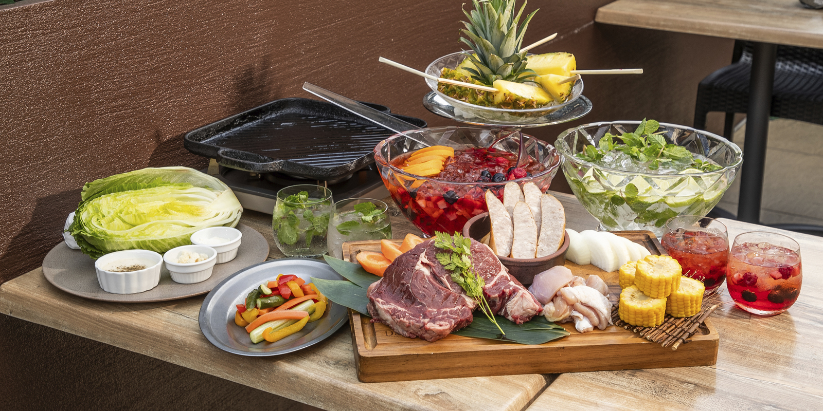 脂質をできる限り抑えつつ、タンパク質とビタミンがたっぷり摂れる食材を厳選してご用意しました。 当日予約もOK。雨でも安心の全天候型ルーフトップ付テラスは貸切利用も可能。 手ぶらで楽しめるテラスバーベキュープランなので、お仕事帰りは星空の下で乾杯! 週末は太陽の下、心地よい風を感じながらガーデンテラスでリゾート気分を満喫!!