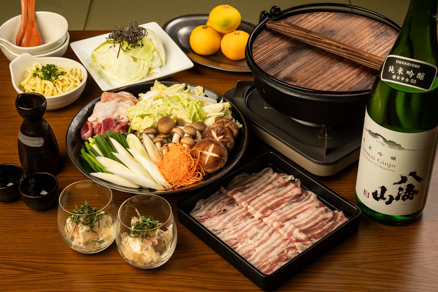 水を一切使わず、日本酒だけで仕上げる贅沢な鍋。旨みあふれる国産もち豚や鶏もも肉、国産砂肝を、 白菜、長ネギ、にんじん、ニラ、しめじ、しいたけなどの旬野菜とともにじっくり煮込みました。 酒の香りと素材の旨みが一体となった、まさに“美酒”の名にふさわしい逸品です。